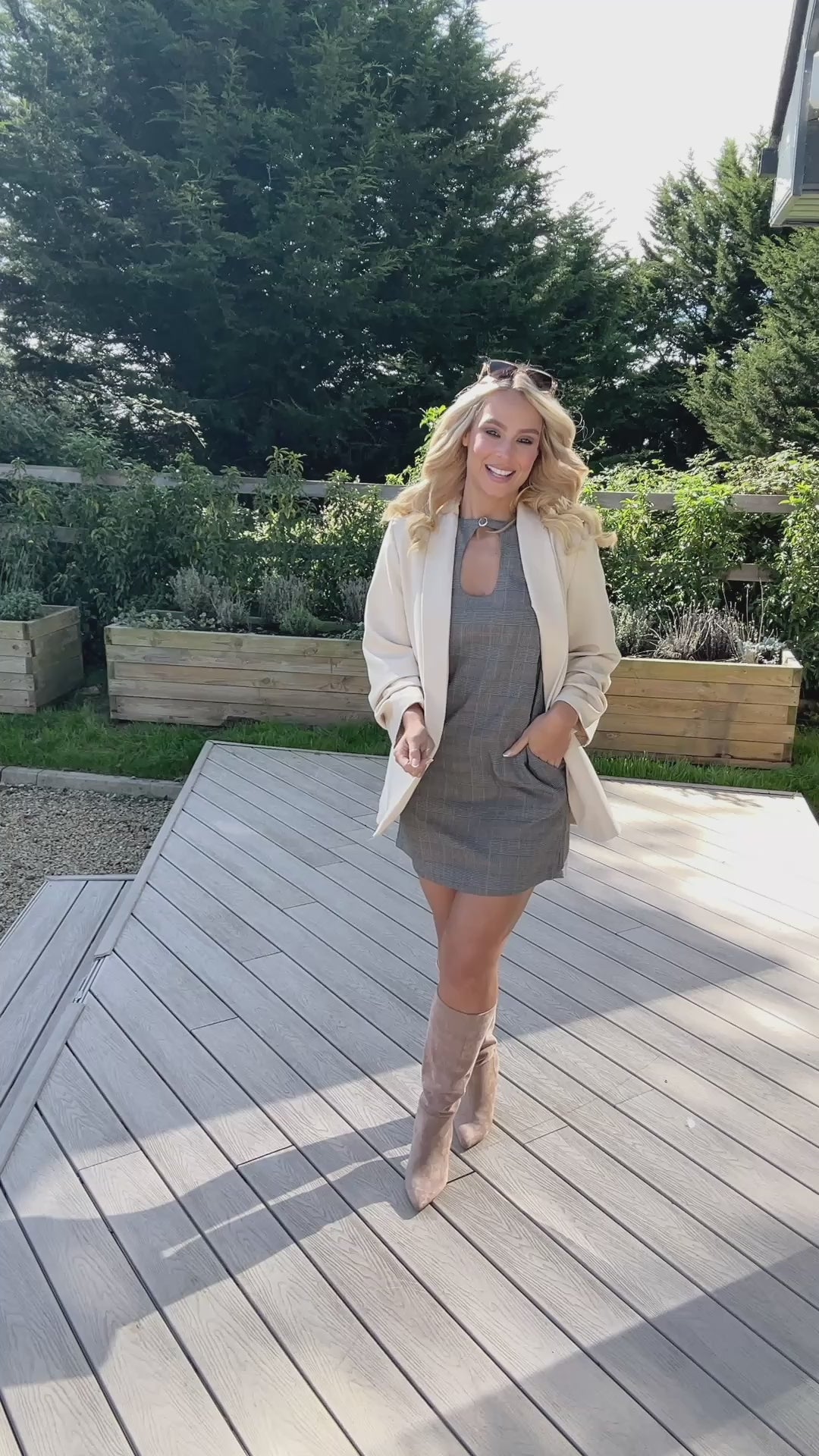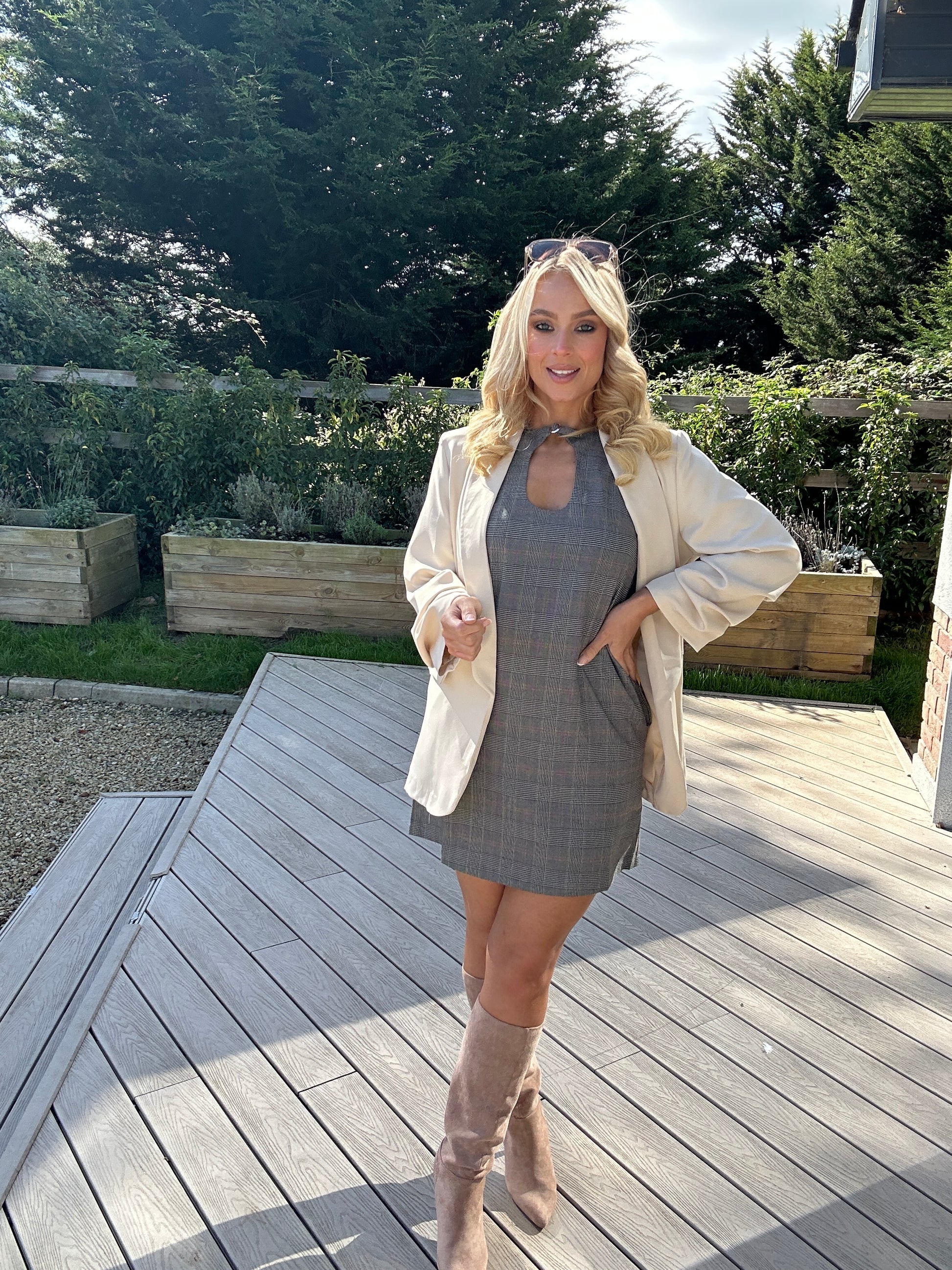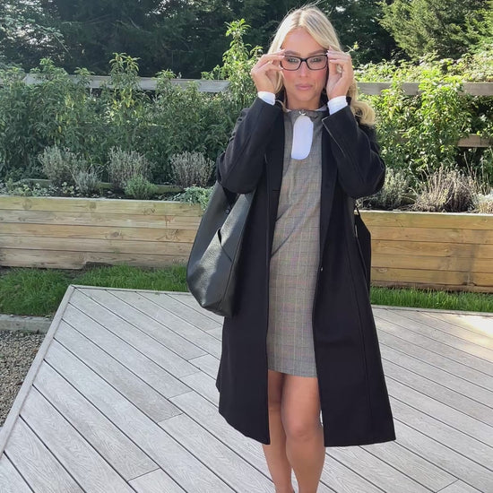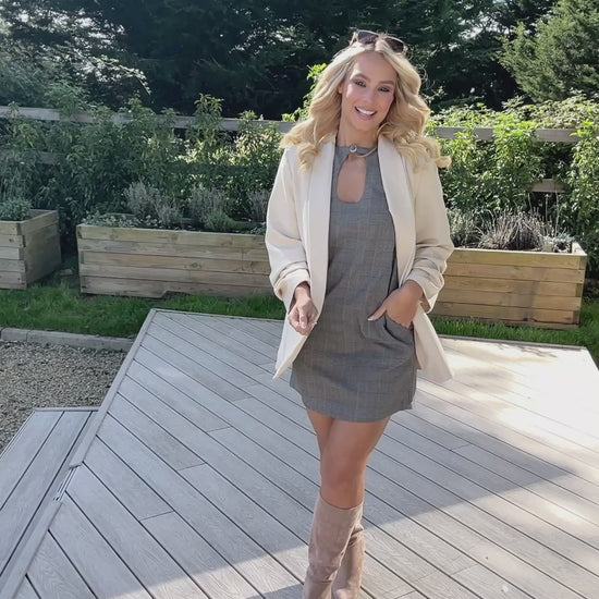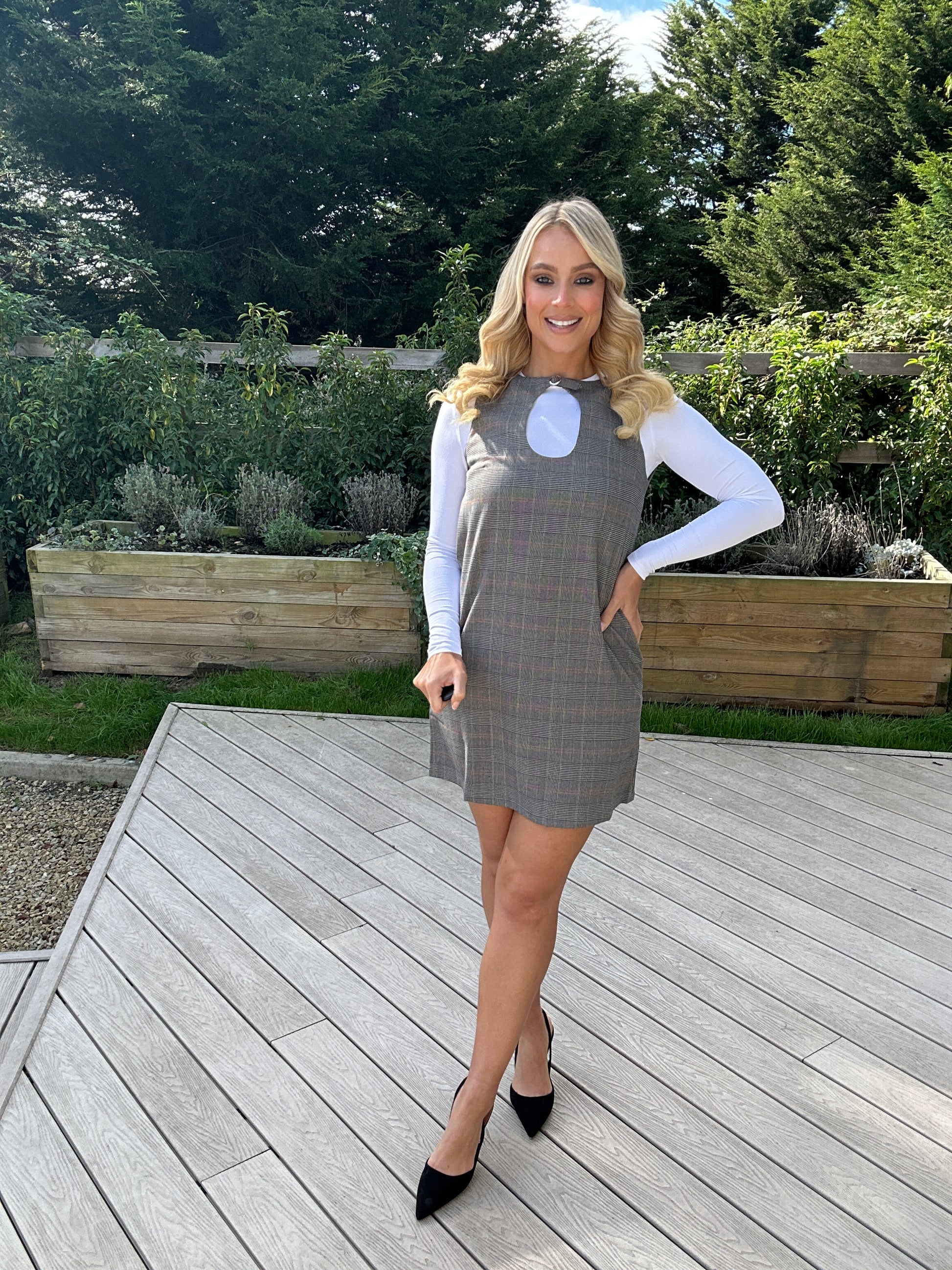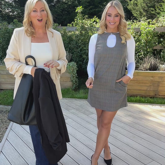 The Ashley Tunic Dress combines classic tweed patterning with practical design, featuring a subtle keyhole detail at the front for a refined touch. Integrated pockets add everyday functionality, making this dress ideal for stylish comfort without compromising on elegance. Perfect for versatile wear, it balances sophistication with convenience.