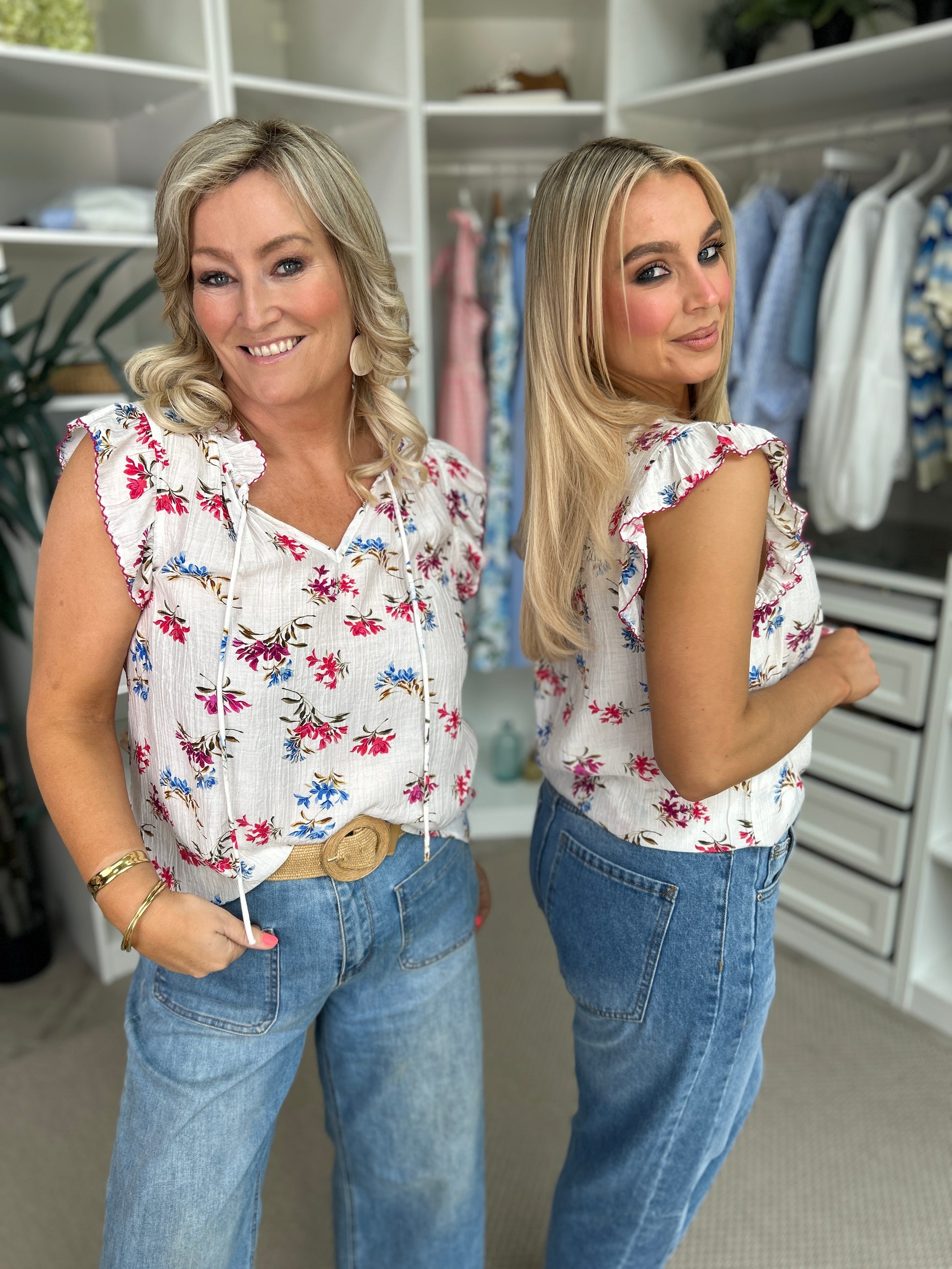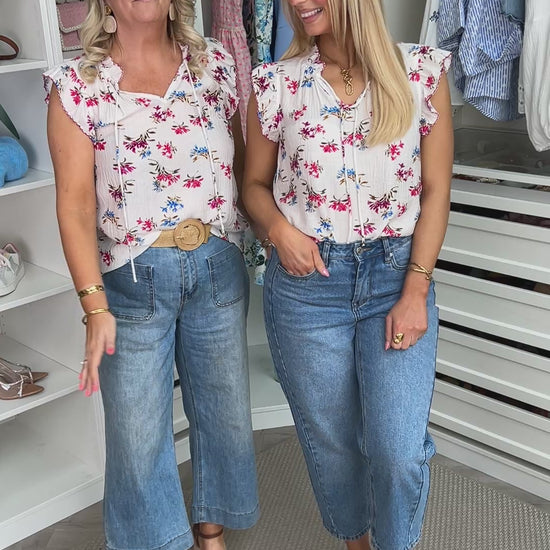 Introducing the Violet Floral Top, a delicate blend of sophistication and playful charm. This sleeveless blouse, is crafted on a pristine white base and adorned with an enchanting spread of pink, red, and blue floral detail. Its frill detail at the shoulders adds a hint of romance while the tie neckline brings a touch of elegance, making it a versatile piece for any wardrobe.
