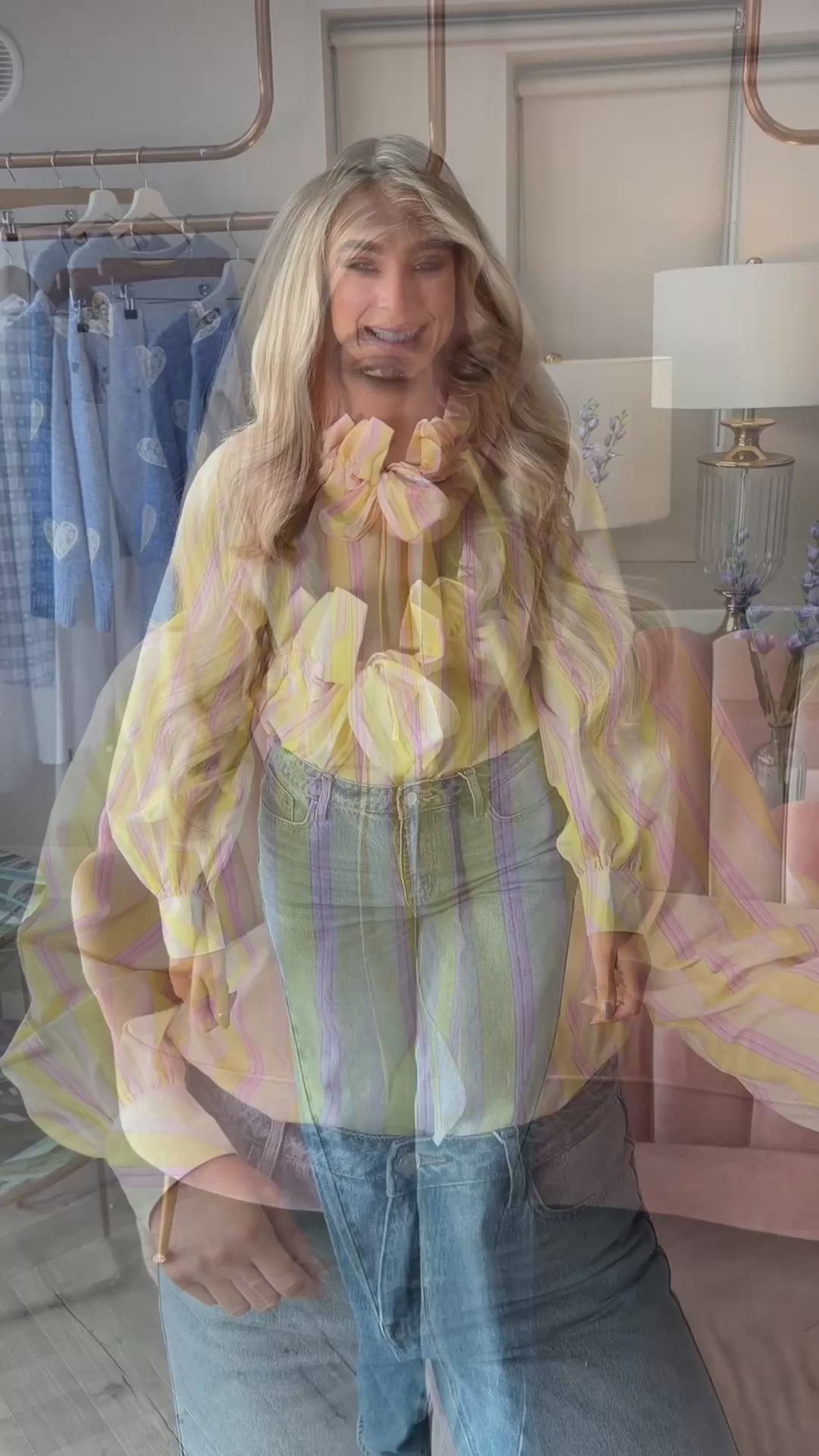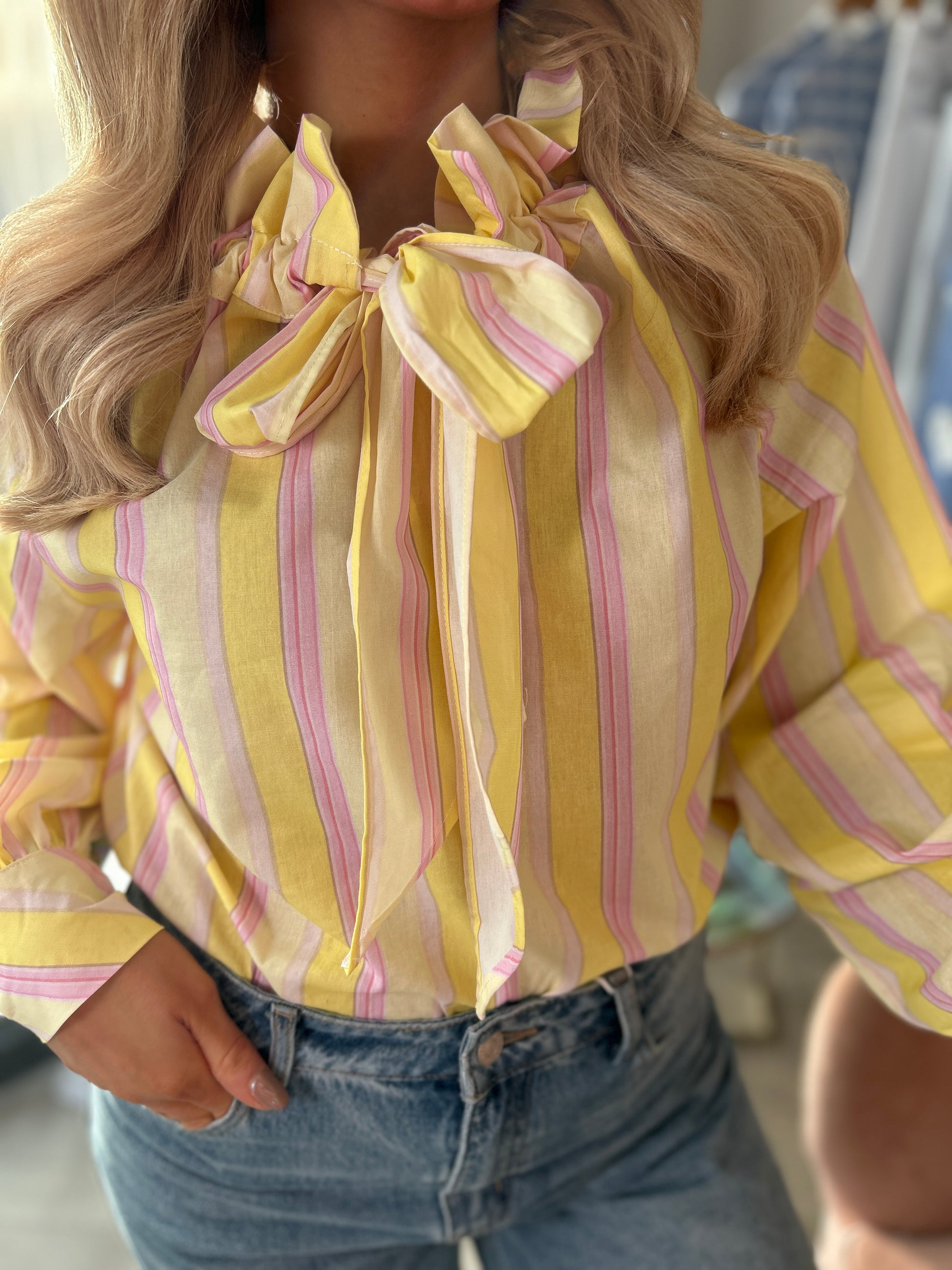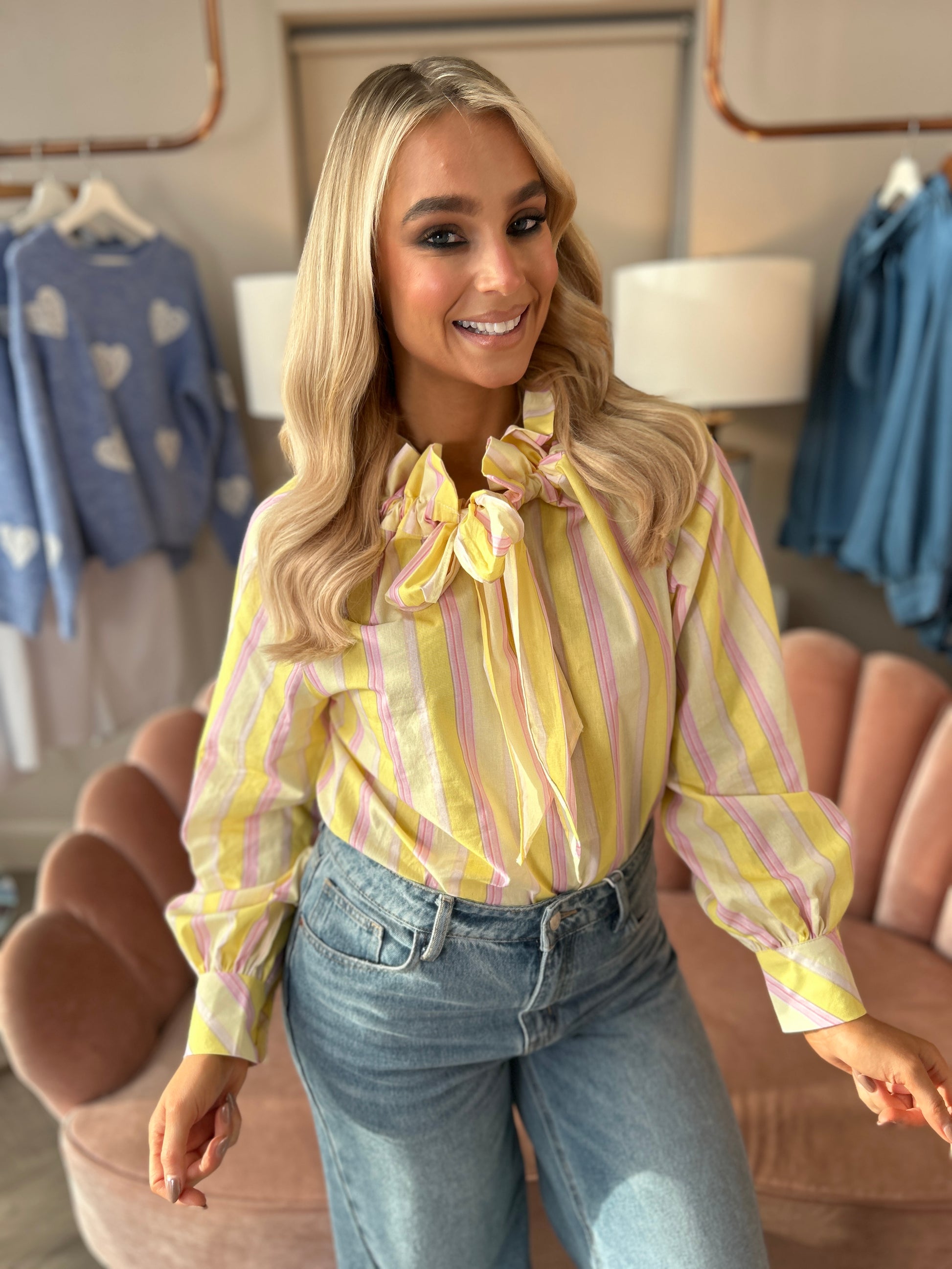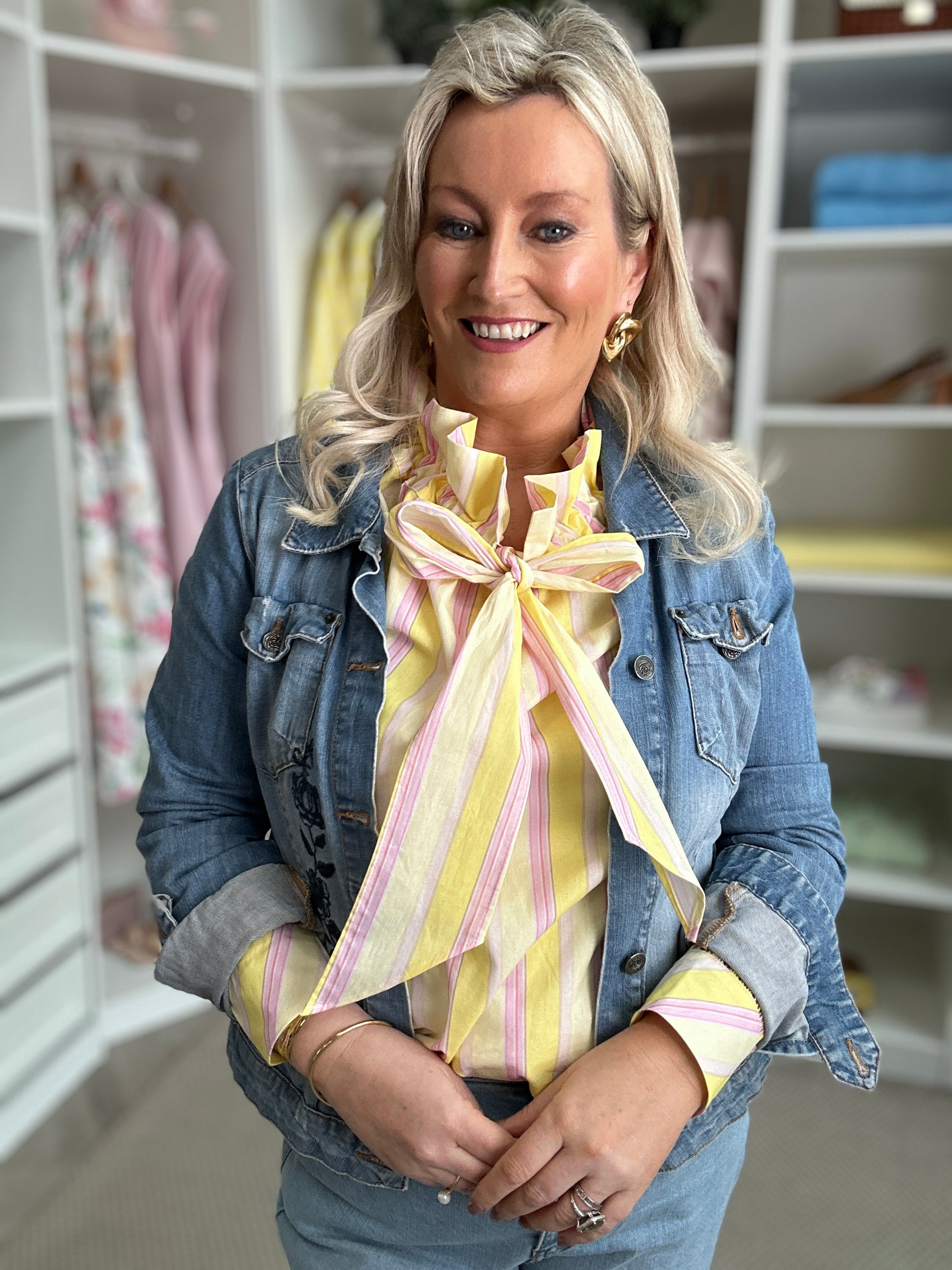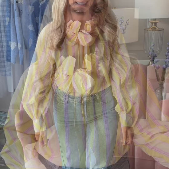 Fun, fashion forward and just dropped!! We love this new ruffle tie collar blouse with a chic stand-up collar, aligning perfectly with this season's must-have trends. Its vibrant candy stripe colours and soft pastels make it a statement piece that says Spring 26 here we come!