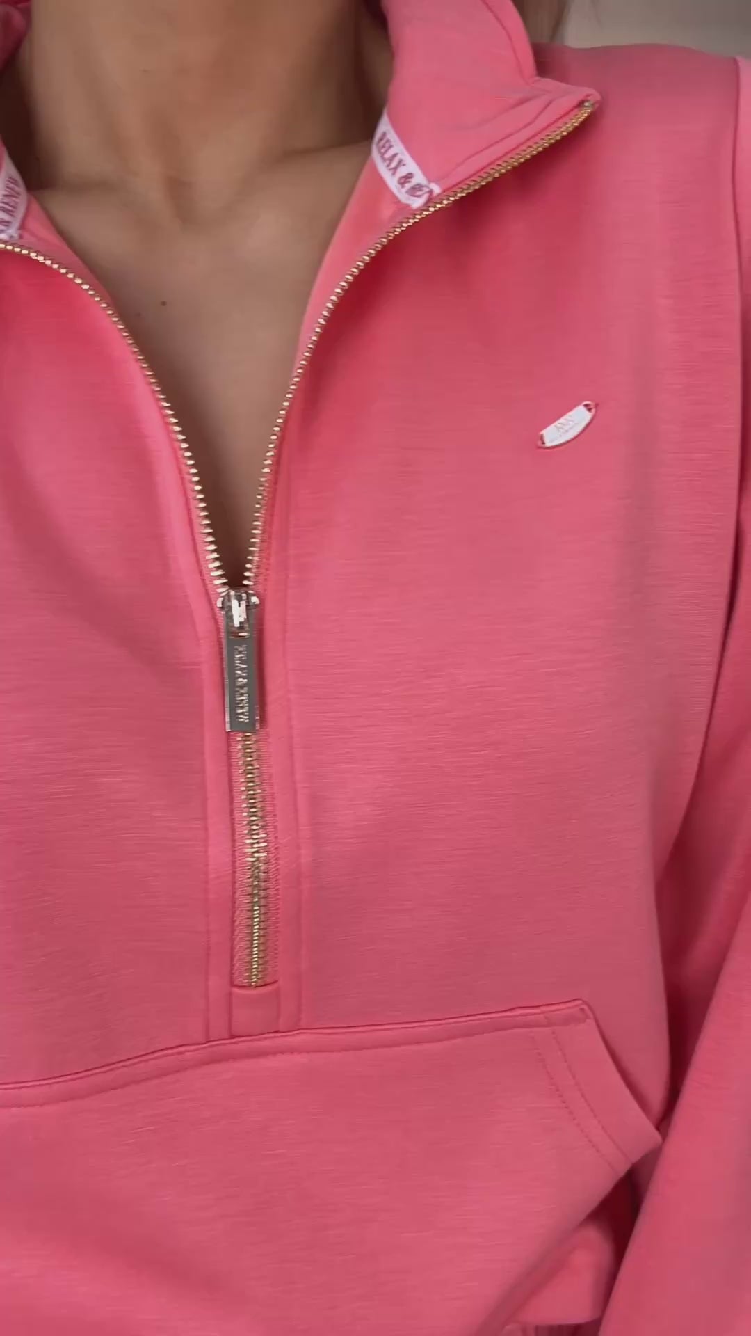 Featuring a high neckline and a sleek gold-tone half-zip fastening, this jumper offers a relaxed fit that's both flattering and easy to wear. The vibrant coral hue brings a fresh and uplifting touch to any outfit, while the front pouch pocket and ribbed cuffs add functional style. Pair it with your favorite jeans for a casual day out or layer it over a dress for a cozy yet chic look. The Jane Half Zip Coral Jumper is not just a piece of clothing; it's a statement of sophistication and comfort that you'll absolutely love.