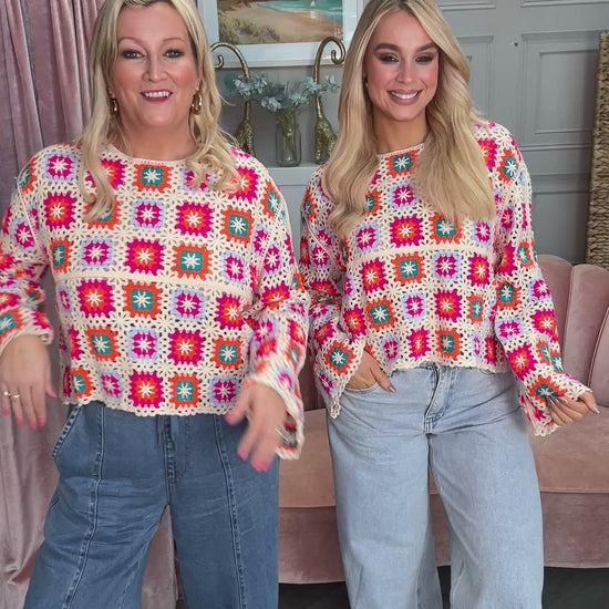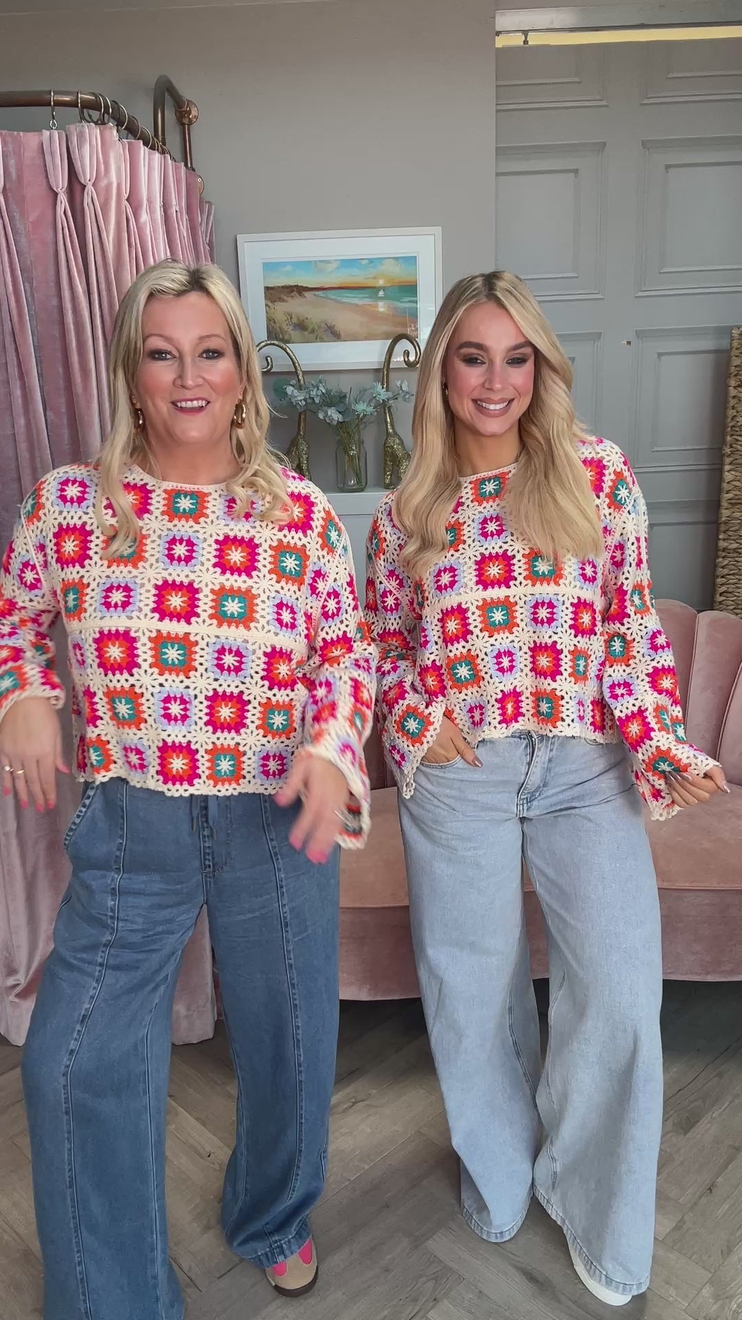 Introducing the Millie crochet square knit, a stunning piece of knitwear that embodies casual elegance and comfort. Crafted with a slightly cropped straight cut, this knit is ideal for pairing with high-waisted jeans or a skirt, offering a chic, balanced silhouette. The flared long sleeves and round neckline further accentuate the relaxed, feminine vibe of this exquisite piece, making it a must-have in your wardrobe.
