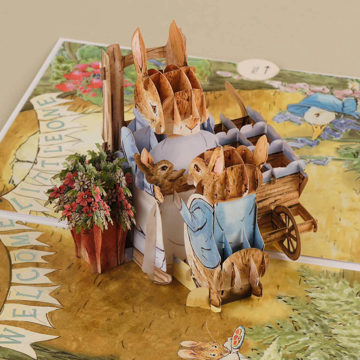 Upon opening, a heartwarming nursery scene unfolds inside Peter Rabbit’s burrow—Mrs. Rabbit gently rocks her newborn baby kit, while Peter Rabbit eagerly peeks in. A delicate 3D bassinet with a blue blanket completes the scene, while Jemima Puddleduck, Mrs. Tiggy-Winkle, and other cherished friends gather to celebrate the new arrival.