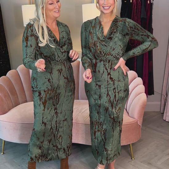 Effortlessly elegant with a modern twist, the Remington Dress is the definition of chic sophistication. Designed in a striking brown and green abstract print, this statement midi is both timeless and trend-forward — perfect for everything from wedding guest style to festive celebrations.