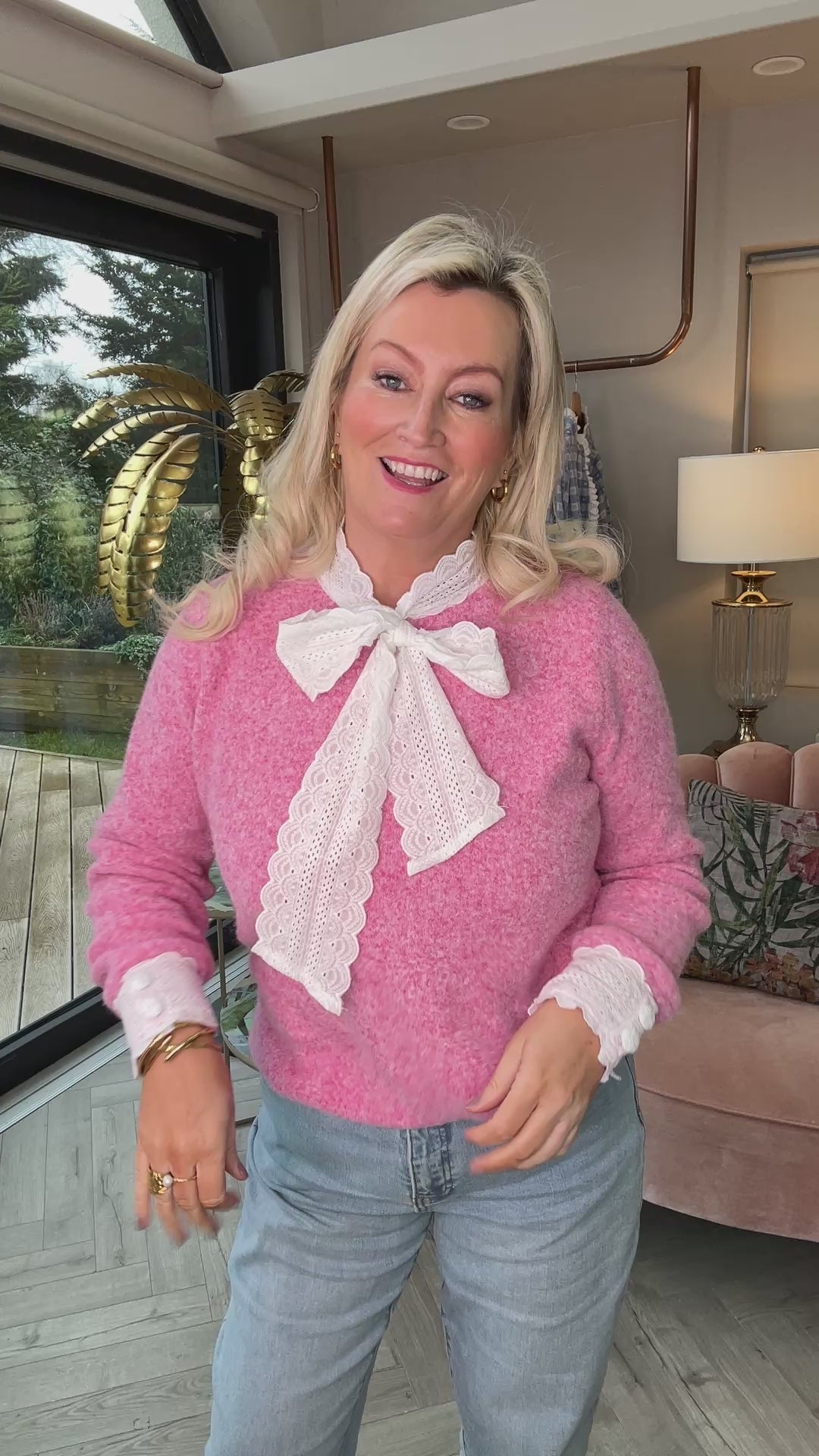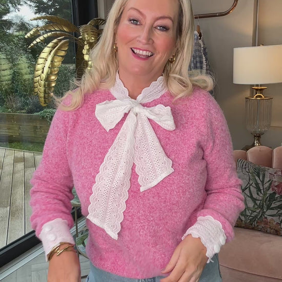 Introducing the Wren Tie Knit Jumper in a delightful Rose Pink. Crafted from a luxuriously soft knit fabric. The eye-catching feature is the attached bow tie at the front, adding a unique twist to the classic cosy knit. Perfect for transitioning through seasons, its vibrant rose pink shade is a breath of fresh air, signaling new beginnings and a fresh colour palette for the new year.
